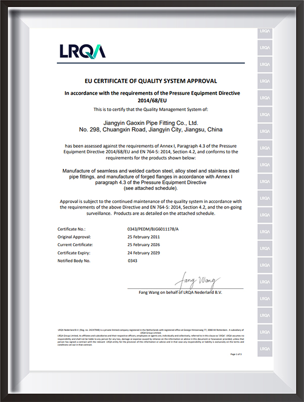 PED, AD2000, EAC, ABS, BV, DNV, NORSOK M650, ISO9001, ISO14001, ISO45001, etc. |